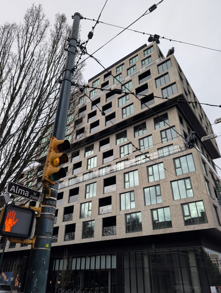 This is a rental building with 165 homes enabled by the (sadly now defunct) MIRHPP policy: the Moderate Income Rental Housing Pilot Program. The basic idea was to grant bonus density in exchange for 20% of the floor area being devoted to below market rental housing. Sadly, the policy was so unsuccessful it couldn’t even get 20 applications, and less have actually been built. It was a good program, but clearly totally ineffective for a city with a housing shortage the size of Vancouver’s. Not even a drop in the bucket.